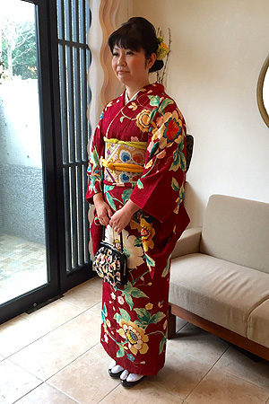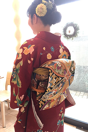 今回は明るい色合い着物なのではじめは少し慣れないご様子でしたが、実際にお召し頂くととてもお似合いになり、春の祝席に相応しい華やかな装いとなり素敵でした。