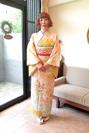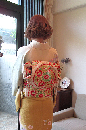 お洋服もとても素敵なお客様で、お選びになったパステルカラーと淡い古典文様の着物も、小物合わせにご自身のセンスがキラリと光るコーディネートとなりました!