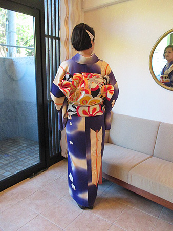 群青色のぼかし地に大胆な矢羽根文様が染め抜かれた付下げに、黒字に赤や黄色の捻梅文様の縁起の良い帯を合わせたこちらのコーディネート。