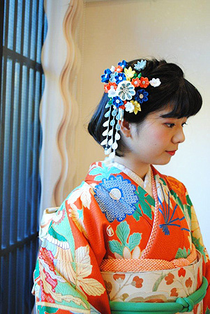 そして、装いのアクセントとして目を引くつまみ細工の飾りは、お母様が成人式のために手作りされたもの!