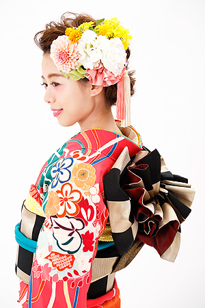 こちらのコーディネートは、青山の美容室「KINGDOM」さんとのコラボレーション企画によるもので、市松文様の帯もボリュームたっぷりに襞を取った帯結びが華やかです。