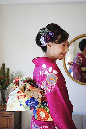 着物の色味を引き立てるように、帯は金地の明るい丸帯を組み合わせました。
