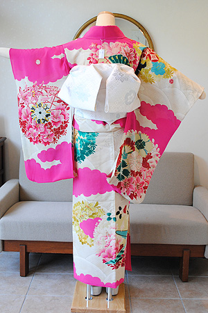 白地の青海波に濃い桃色の雲取り文様。雲の合間から湧きでてきたかのような、大きな3色の花丸文が鮮やかな中振袖です。