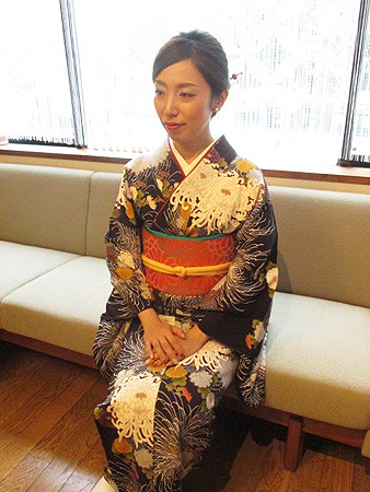 深い紫の地にぱっと咲いた真っ白な菊が、お客様のお顔立ちを一層華やかに引き立て、ため息の出てしまうような美しい着物姿でした!