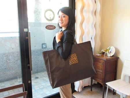 商品はこんな大きさの肩かけバッグに入れてお渡しいたします。