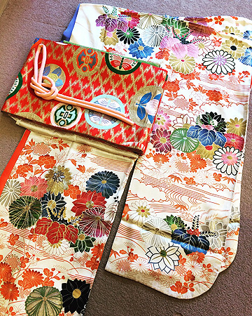 写真の振袖:A-33菊花牡丹文様裾ぼかし手刺繍アンティーク振袖 レンタル料金一式 250,000円+税