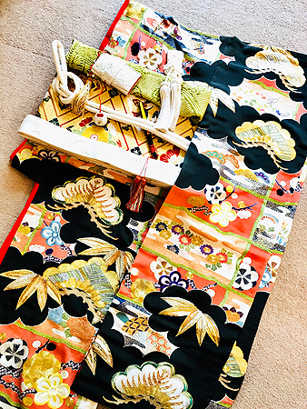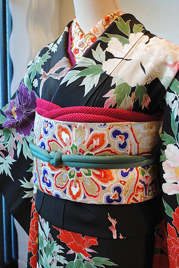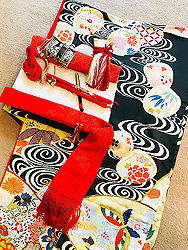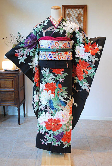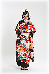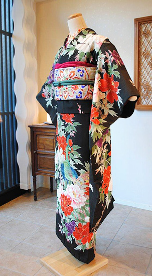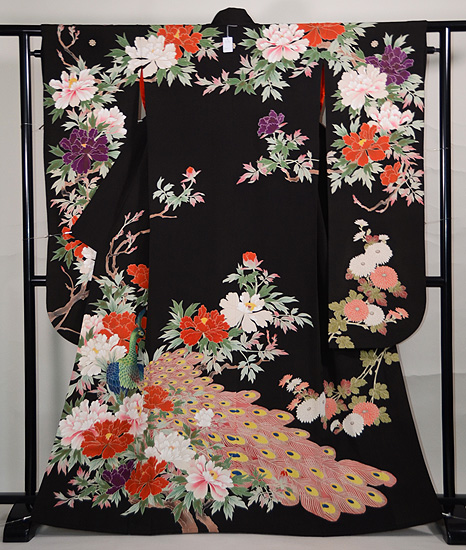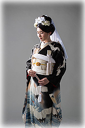 優しい墨黒の地と色とりどりの吉祥文様が、幸せいっぱいのご新婦様の笑顔を可憐に彩っています。